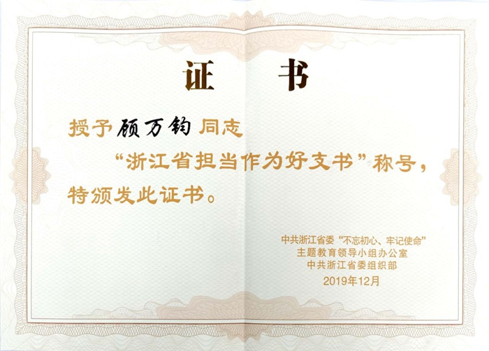 顧萬鈞同志自擔任支部書記以來,始終堅持以“八八戰略”為指引,牢固樹立省委關于“開放強省”的工作導向,積極主動融入國家“一帶一路”戰略布局,有效實現了黨建與經營工作互促共進、融合互通的良好局面。多年來,他一方面立足外貿出口主業,主動調整業務市場結構,不斷加大對“一帶一路”沿線國家如東歐、非洲、中東等新興市場的開拓力度,努力當好服務“開放強省”戰略的排頭兵;另一方面不斷深化“科工貿一體化”的經營模式,努力增強拳頭產品的核心競爭力。在他的努力下,2019年浙江土畜集團漆刷產品出口實現3800萬美元,連續10年位居全國第一,超出第二名50%左右,成為全國漆刷行業名副其實的領軍人物,也是紅船精神、浙江精神在基層的生動體現,充分展示了基層黨員干部主動擔當、敢于作為的良好形象。